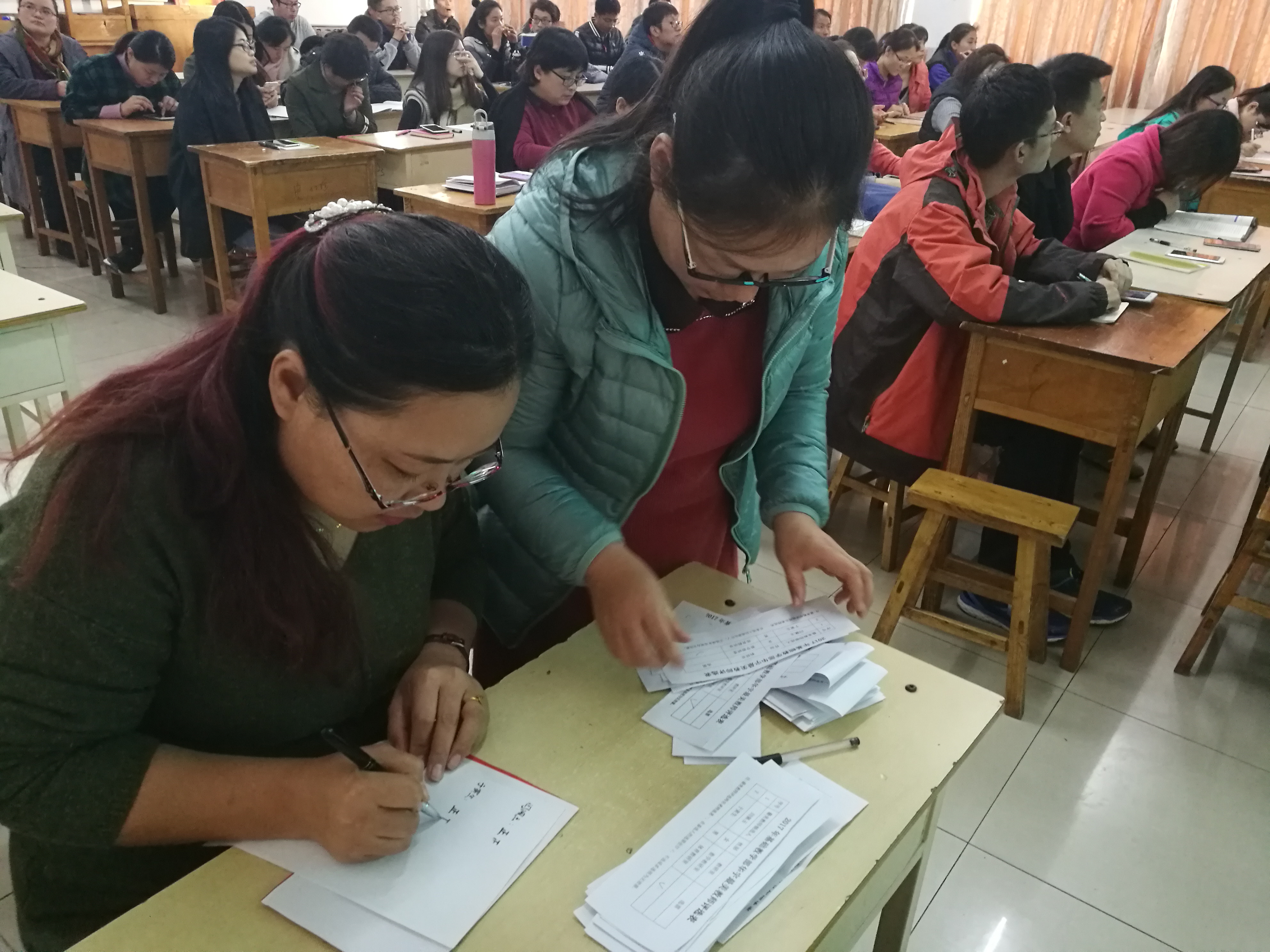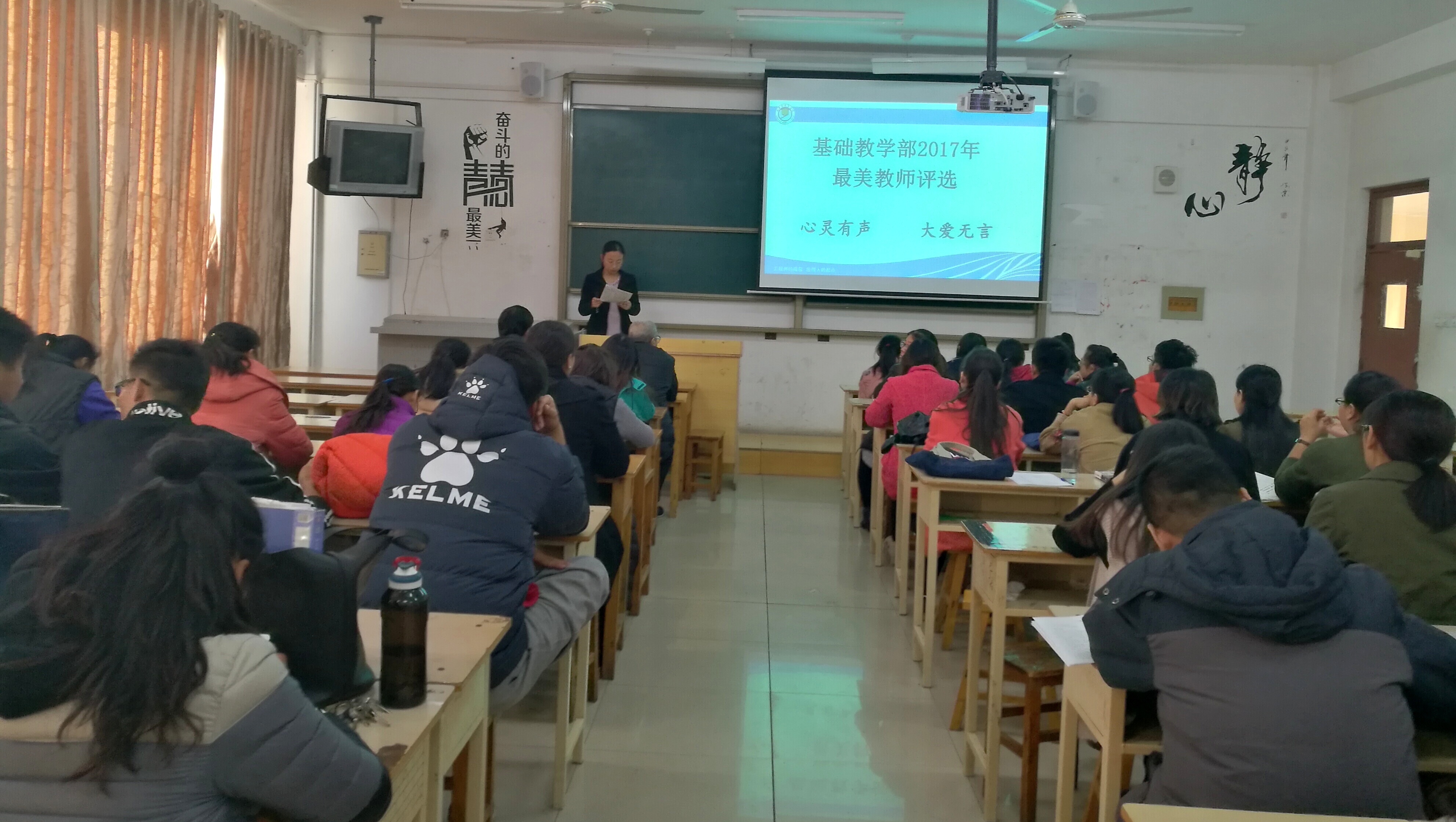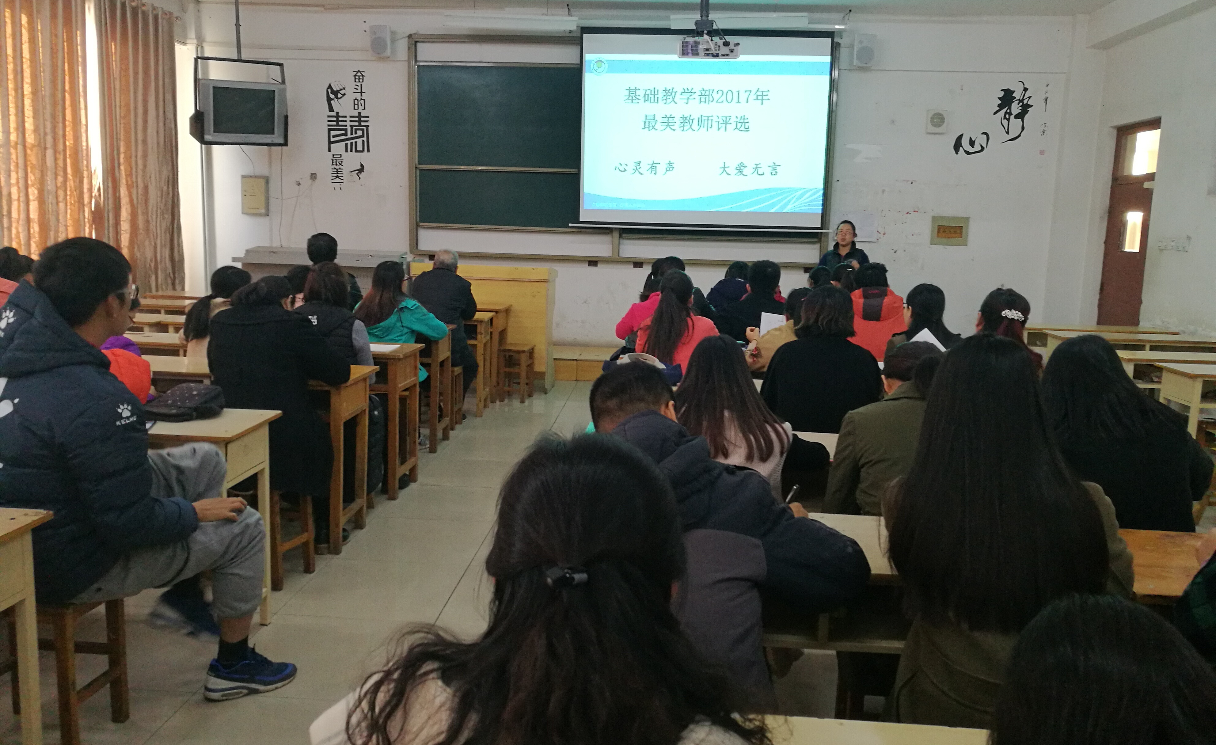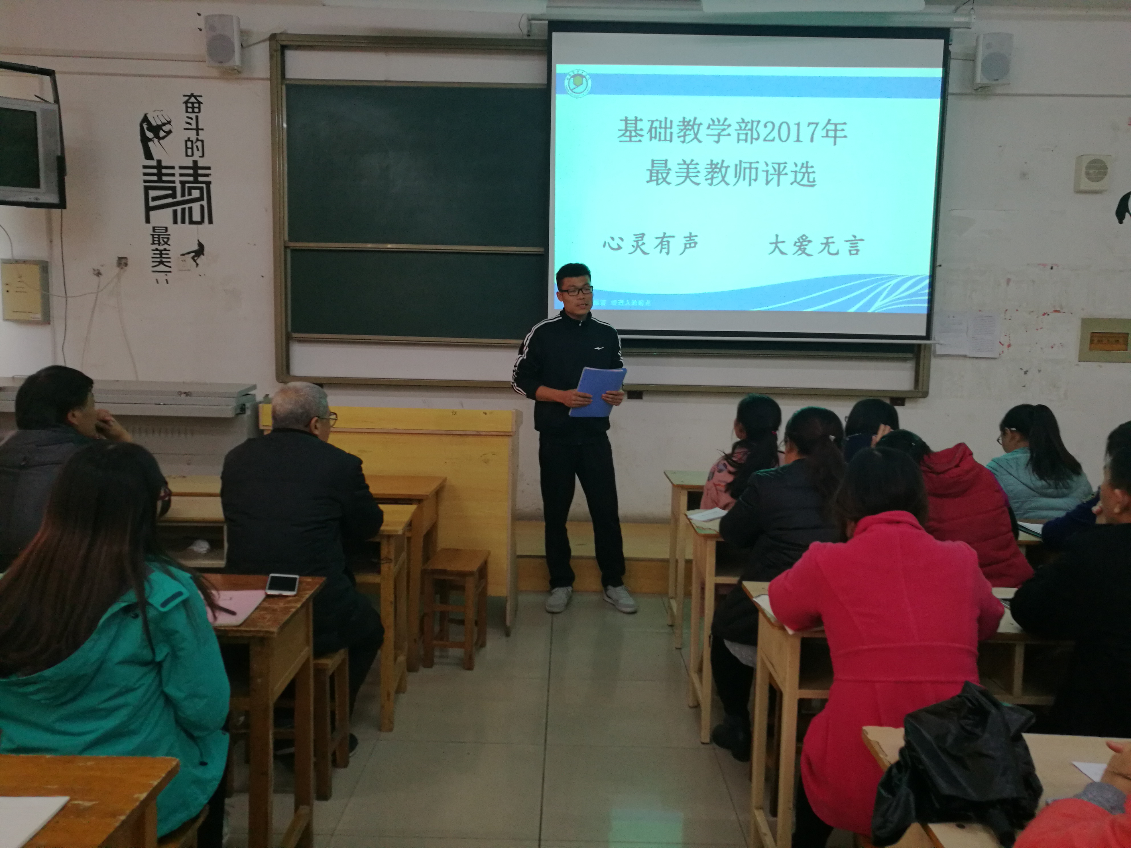 会上,李主任向大家传达了我校关于2017最美教师评选的要求及此次评选活动的流程。随后,闫佩玉老师和于寅生老师分别对自己从教以来的教学、科研及各分项工作情况进行了简要总结。两位老师身体力行,用实际行动诠释了“心灵有声,大爱无言”的内涵,赢得了在座教师的赞许和掌声。投票环节,在座教师认真填写选票,选出心中的最美教师。进过紧张统计,最终数学教研室闫佩玉老师以领先优势当选为基础教学部2017年最美教师。