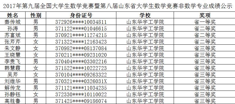 2017年11月16日,第九届全国大学生数学竞赛暨第八届山东省大学生数学竞赛全国大学生竞赛山东赛区组委会公示了本次竞赛成绩,我校共获得本科非数学专业组全国二等奖1项,全国三等奖3项;山东省一等奖1项,二等奖3项,三等奖9项。