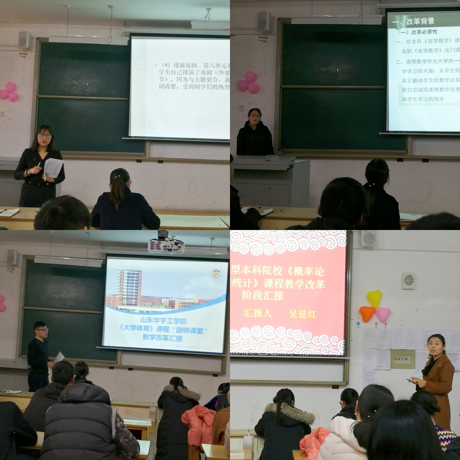 课程改革经验交流会主要为高职《大学英语》、高职《高等数学》、本科《大学体育》和本科《概率论与数理统计》四门课改课程的阶段性成果汇报。林静老师、程秀丽老师、于寅生老师、吴延红老师分别对所负责课改课程进行了总结,四位老师带领其教学改革团队,按照我校推行课改课程的要求,积极进行课程模式和教学方法的改革。英语教研室高职大学英语推行课前+课上+课后教学模式,精准分析,有效教学。高职《高等数学》布置完成了两次数学大作业,并根据学生答题情况记录作业成绩,进行量化赋分。本科《概率论与数理统计》任课教师根据学生完成的数学建模作业及调查报告对学生的最终成绩给出不同的等级。大学体育课改从体育必修课、体育选修课、阳光体育、体育俱乐部等四大方面入手,并结合我校实际情况进行探索性研究,制定一份详细的改革实施方案。