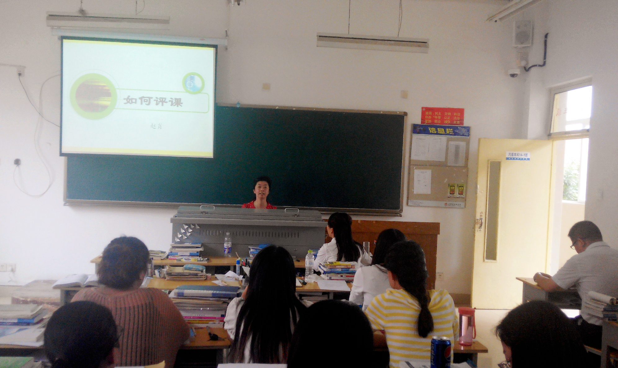 首先,赵教授从三个方面就什么是评课?为什么评课?如何评课?的问题进行了阐述,让大家明白了评课的内涵和评课的重要意义。其次,赵教授又详细阐述了评课的环节和步骤,发展过程,使老师们对评课中的具体内容有了更深入的了解,尤其让老师们对教学思想的概念有了更全面的认识。再次,赵教授给大家强调了评课的定义,让大家明白了,评课实际上是教学经验的交流、教学方法的探讨、教学观念的更新、教学艺术的展示和教学水平的提高的一个重要途径。最后,赵教授又结合刘伟伟老师省级获奖教学视频实例,深入浅出地分析讲解了其中的优点和不足,使老师们在实践教学中对于教学目标的把握、重难点的定位、教学环节的设计以及教师素养的提高等问题都有了更直观的认识。