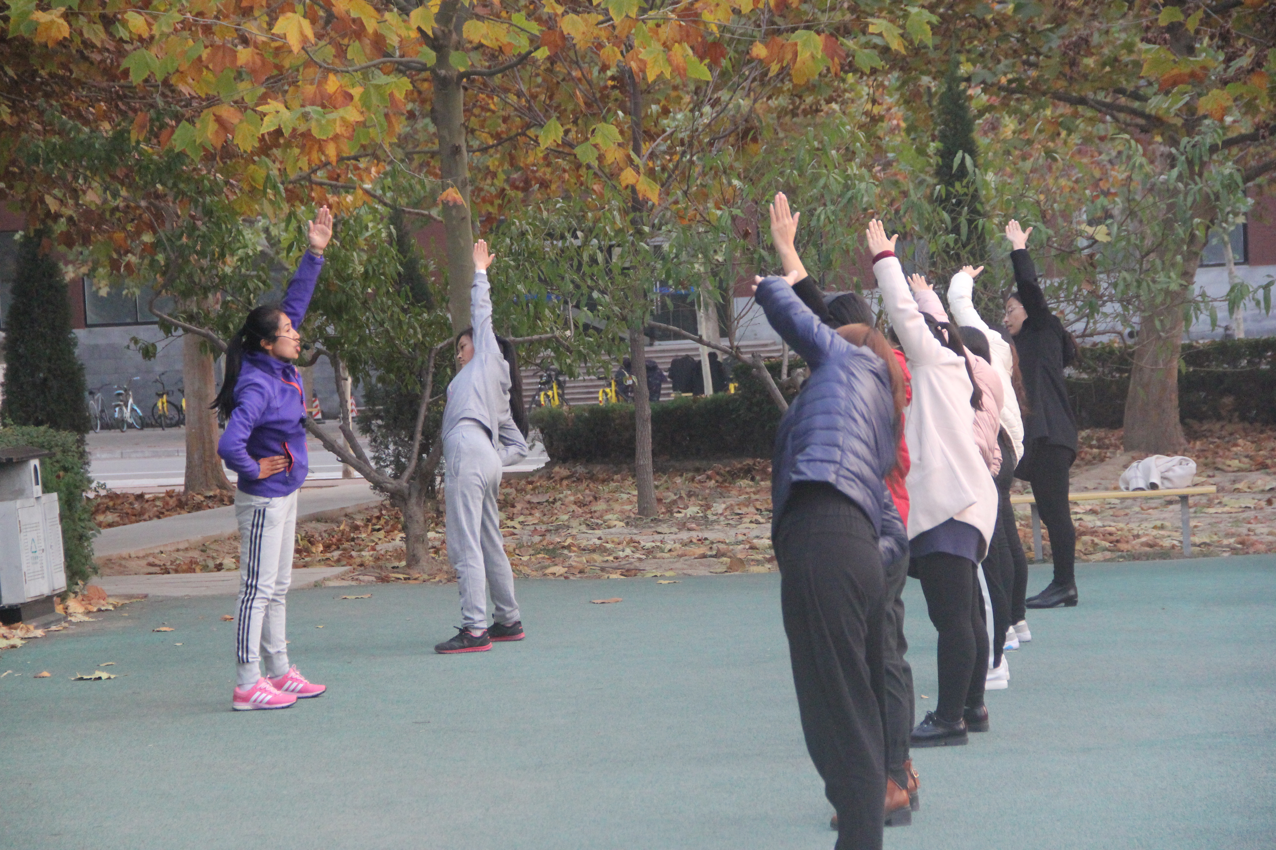 11月6日下午4:30分,操场上,微风习习,基础教学部全体教师在基础教学部副主任李琦的带领下,进行了第九套广播体操的训练。