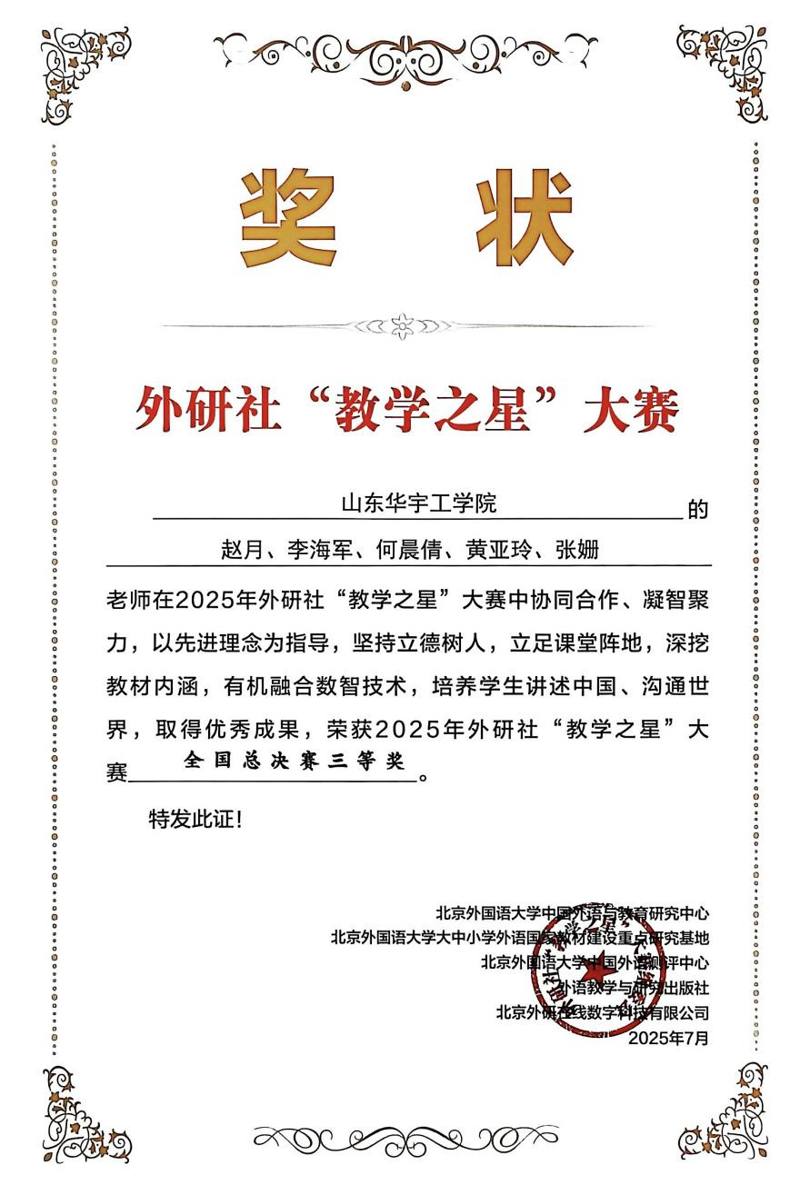 近日,2025 年外研社“教学之星”大赛全国半决赛第2场在武汉成功举办。太阳集团tyc539macau教师团队(赵月、李海军、何晨倩、黄亚玲、张姗)在此次大赛中表现出色,从众多优秀参赛队伍中脱颖而出,荣获全国总决赛三等奖。